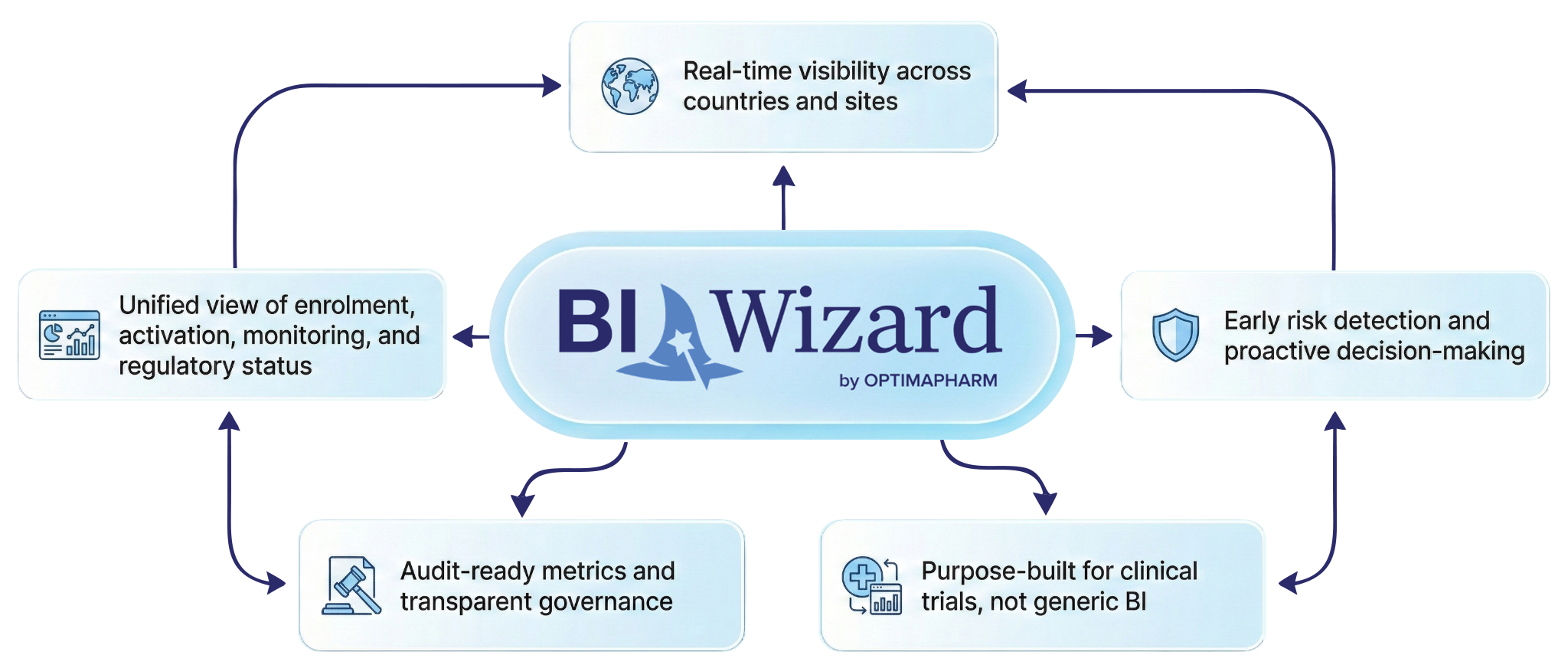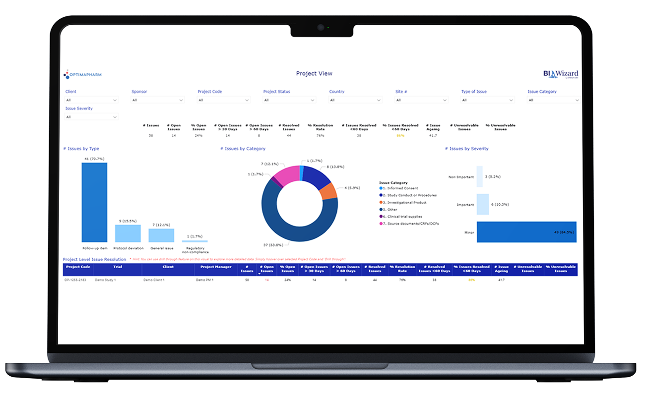 BI WIZARD brings data from multiple clinical systems into a single, intuitive reporting environment. Live dashboards transform operational complexity into clear, actionable insights, helping sponsors manage studies faster, smarter, and with confidence.